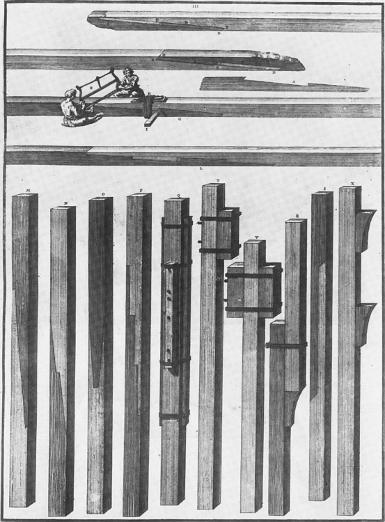 L Annestatura definita di tipo meno usuale; M Annestatura in piedi con unghiature e incastri fermata con chiodi e cavicchie; N Annestatura a penna con risalto al centro, concava nella parte più grossa e convessa nella parte più sottile; O Annestatura a forbice; P Annestatura a risalti; Q Annestatura testa a testa fermata su tutti i lati da travicelli incavicchiati e inchiodati e da staffe di ferro; R Annestatura per accostamento con staffa di ferro e gattello; S Annestatura mezzo a mezzo; da Scavizzi: Edilizia nei secoli XVII e XVIII a Roma, Roma 1983, p. 79 |